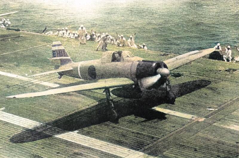 Japanese 'Zero' fighter taking off from a carrier during the battle.