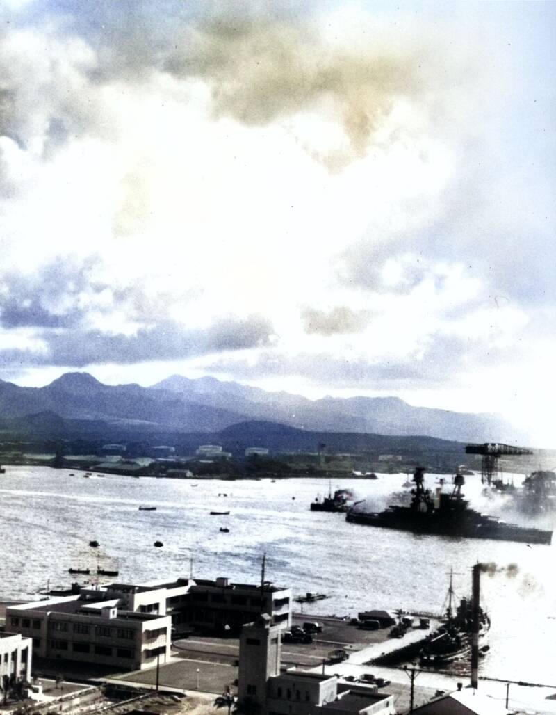 One of the most infamous images from the Japanese attack on Pearl Harbor: A small boat rescues a seaman from the 31,800 ton USS West Virginia (BB-48), which is burning in the foreground. Smoke rolling out amidships shows where the most extensive damage occurred.