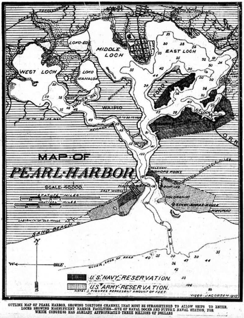 A map of the construction challenges for improving Pearl Harbor from the Evening Bulletin in 1911.