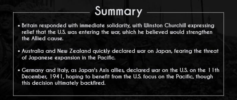 In contrast, Germany and Italy, as Japan’s Axis partners, viewed the attack positively. On the 11th December 1941, both nations declared war on the United States, further escalating the global conflict.