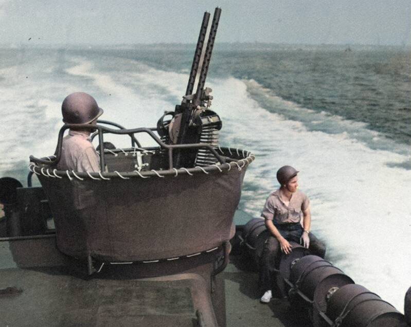 Twin Browning M2 .50 caliber machine guns seen here aboard PT-107, an 80-foot Elco torpedo boat during exercises in 1942.