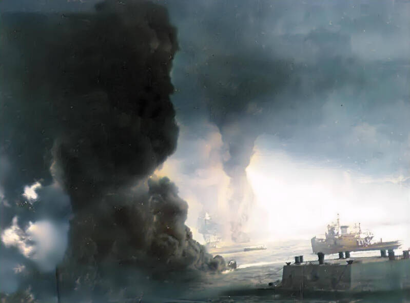 These mighty vessels, once symbols of American naval power, lay crippled in the shallow waters, some engulfed in flames.