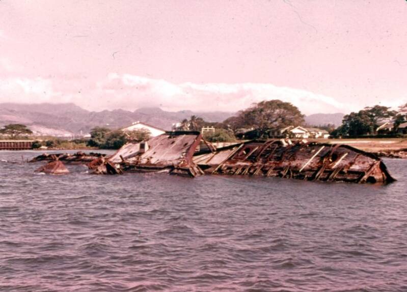 Devastation at Pearl harbor: Helena (center left) at 1010 dock after the attack; Oglala has been towed astern where she capsized. Smoke clouds from the burning destroyers Cassin and Downes rise in the distance beyond Helena, while those from the battleship Nevada are visible to the right. The battleship California is down by the bow but has not yet sunk.