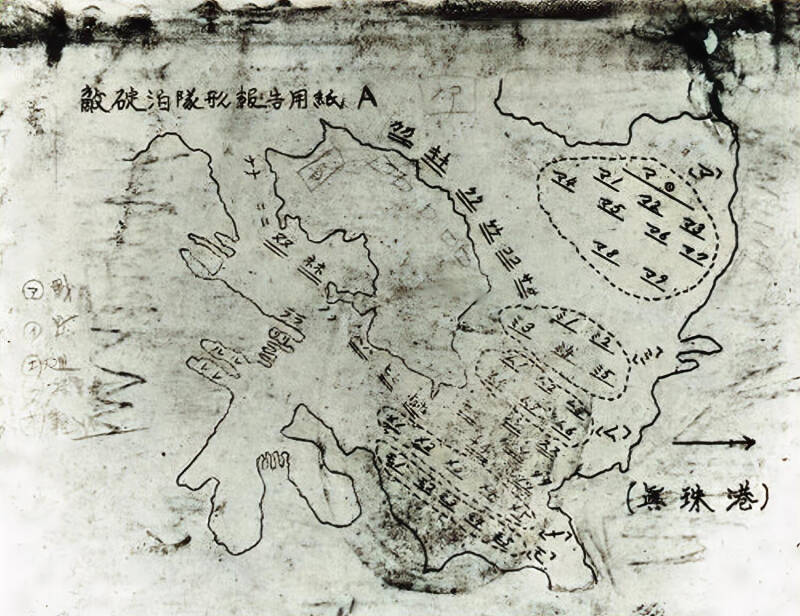 Recovered from a Japanese Navy aircraft downed during the attack on Pearl Harbor, 7 December 1941. The chart identifies ship mooring locations and is entitled (at upper left): Report on positions of enemy fleet at anchorage A. Code at left represents ship types (Letter figures are written in katakana): A - battleship; I - aircraft carrier; E - cruiser; U - special service ship; O - light cruiser. Mooring locations are coded with paired katakana figures or with katakana plus an arabic numeral, but do not specifically identify the ship types moored there.