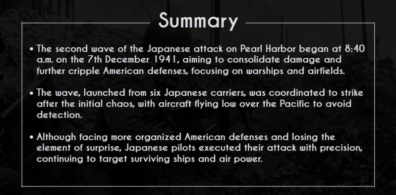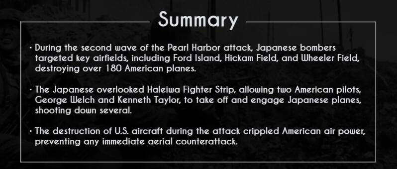 The second wave also aimed to destroy remaining American aircraft on the ground, focusing on key airfields such as Hickam Field, Wheeler Field, and Ford Island.