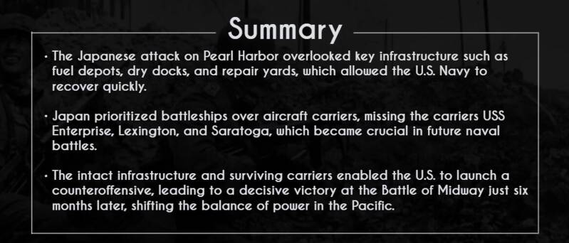 While the attack inflicted devastating damage on battleships, destroyers, and aircraft, vital facilities such as fuel depots, dry docks, and repair yards remained untouched.