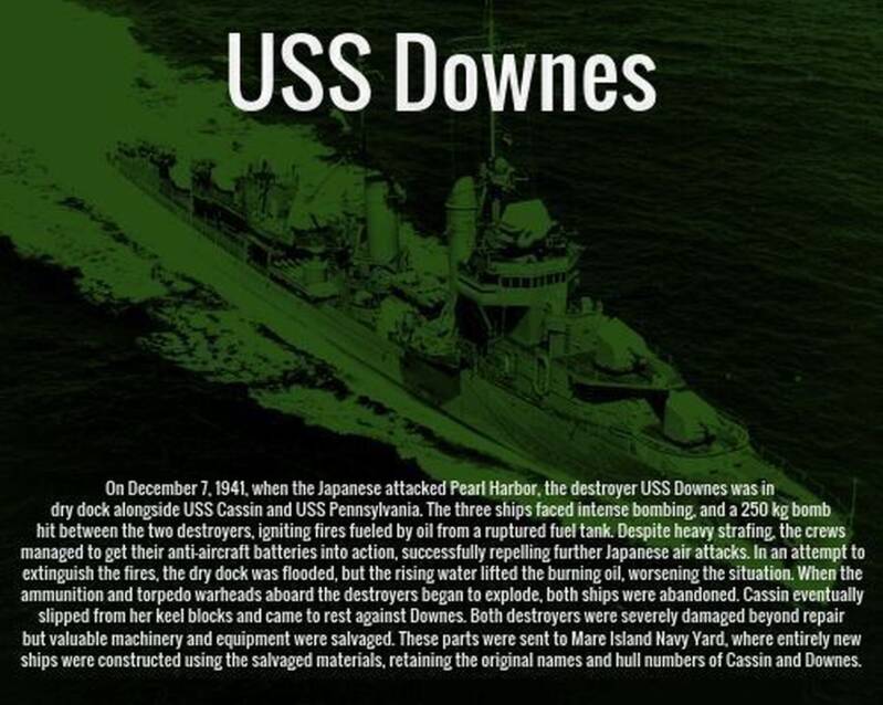 The destroyers USS Cassin and USS Downes, both in dry dock, were struck by bombs, causing devastating fires and extensive damage to both ships, with the dry dock itself became a chaotic scene as personnel struggled to contain the fires.