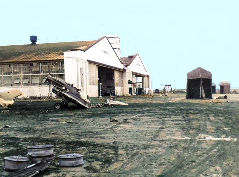 Wreckage in front of Hangar 4, Wheeler Field after the Japanese attack. Wheeler Field, a key airbase in Hawaii, was heavily targeted during the Japanese first and second waves at Pearl Harbor. The first wave destroyed numerous U.S. aircraft on the ground, crippling air defenses. In the second wave, Wheeler Field sustained further bombing, limiting any remaining operational aircraft.