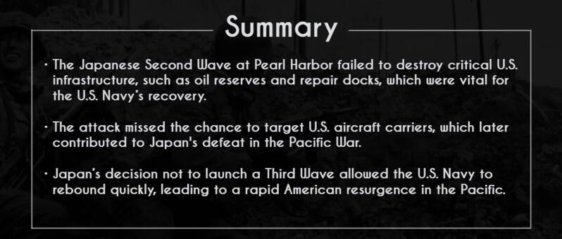 While the first wave had inflicted significant damage, the Second Wave failed to destroy critical U.S. infrastructure, such as oil reserves, repair docks, and submarine bases, which were essential for the U.S. Navy’s recovery.