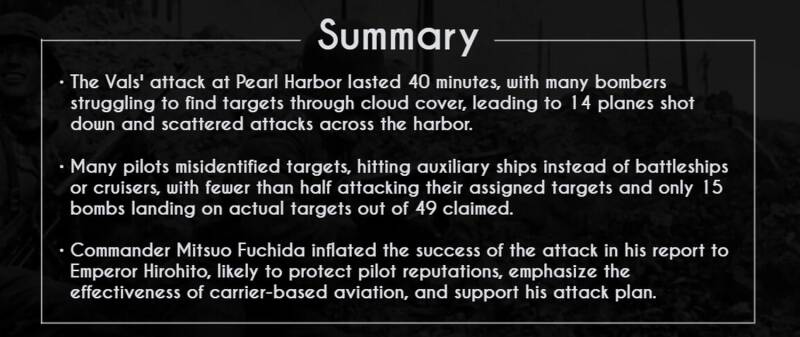 The Vals' attack on Pearl Harbor stretched over 40 minutes as the remaining 60 or more bombers struggled to find gaps in the heavy cloud cover.