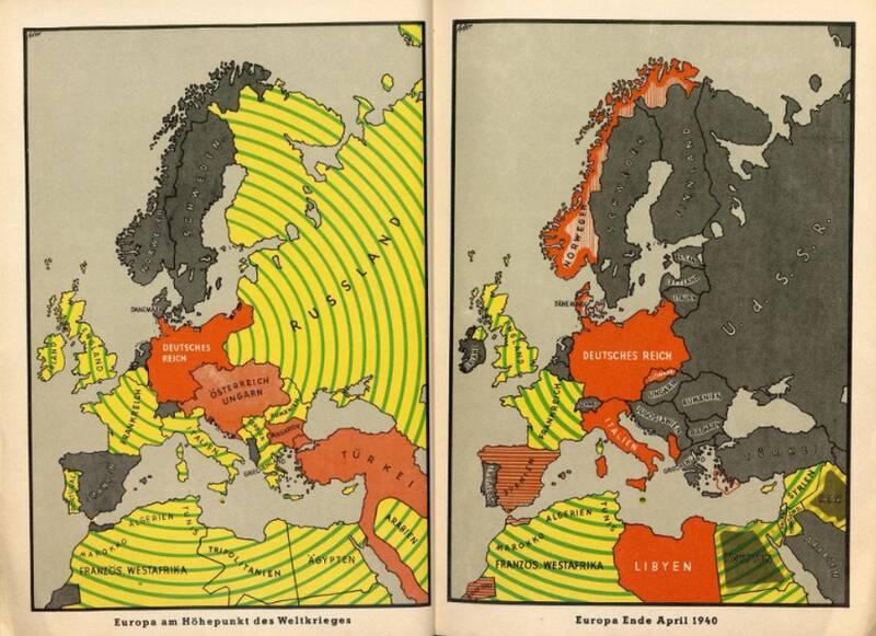 Nazi propaganda map from the Phoney War. Translation (left) "Europe at the height of WWI", and (right) Europe at the end of April 1940". It's supposed to show that the Allied tactic of encircling Germany had been broken. Note that it has the USSR coloured as an ally to Germany.