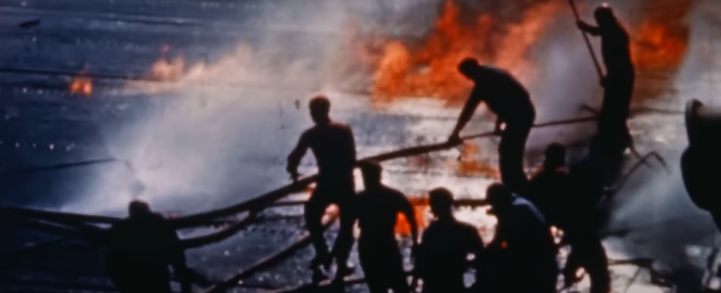 The Battle of the Coral Sea: US Sailors struggle to put out the flames on the deck of a carrier after Japanese air attack.