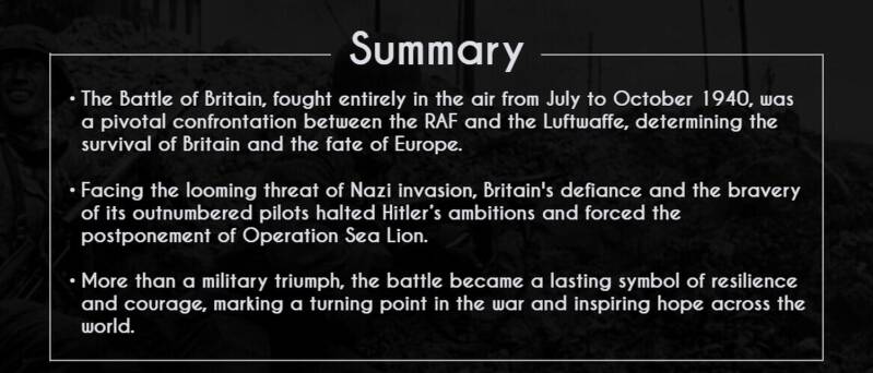 On the eve of the Battle of Britain, the RAF stood as the final barrier between Hitler and a successful invasion of the UK. With France fallen and Europe under Nazi control, Britain faced the full force of the Luftwaffe. Hitler knew air superiority was essential for Operation Sea Lion to proceed. Though outnumbered, the RAF's fighter pilots, radar network, and indomitable spirit formed a thin but unbreakable shield guarding the nation from impending invasion and occupation.