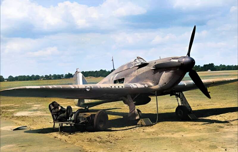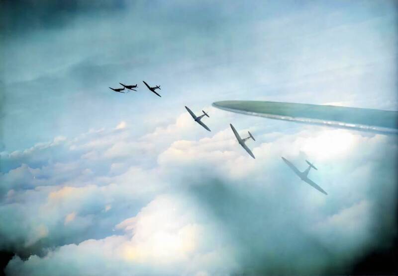 RAF Hurricanes and Spitfires engaged in chaotic dogfights.