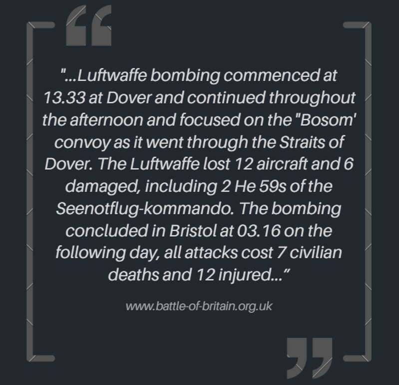 Early in the morning, formations of Bf 109s and Bf 110s from Erpr.Gr. 210 and III./ZG 26 attacked the Dover Balloon Barrage. Seven balloons were destroyed, fires broke out in the harbour, and nearby buildings sustained damage.