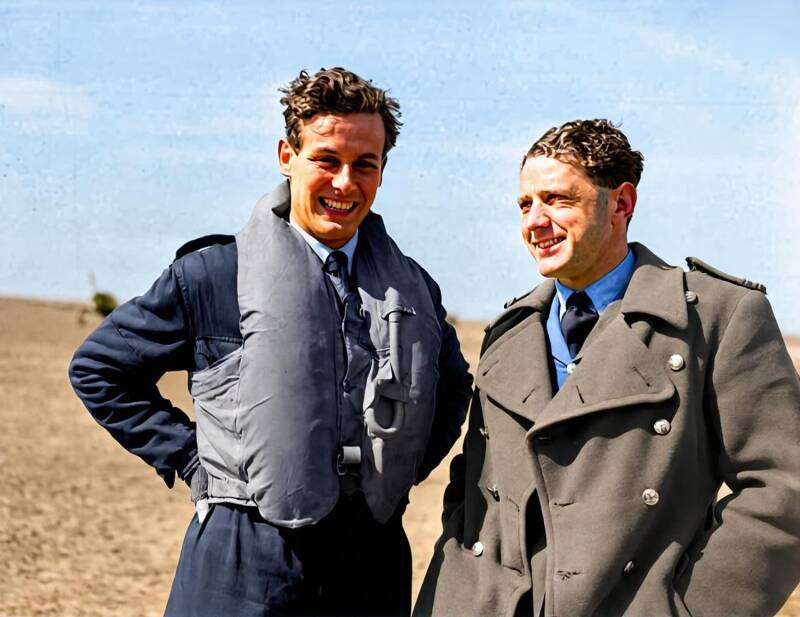 Aircrew at RAF 43 Squadron - Flight Lieutenants Peter Townsend and Caesar Hull at Wick, Scotland April 1940. On July 11th 1940, Townsend - now a Squadron Leader at 85 Squadron - was shot down in his Hurricane during an attack on a Dornier 17. He baled out and survived to fight again.