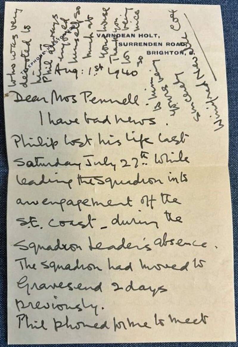Flight Lieutenant Cox was friendly with a Naomi Pennell in Brighton, whose parents were noted for organising social occasions for their daughter's circle of friends. The letter to Naomi's mother from Cox's mother, who was 'Commandant' of the Sussex branch of the British Red Cross, details his tragic loss.