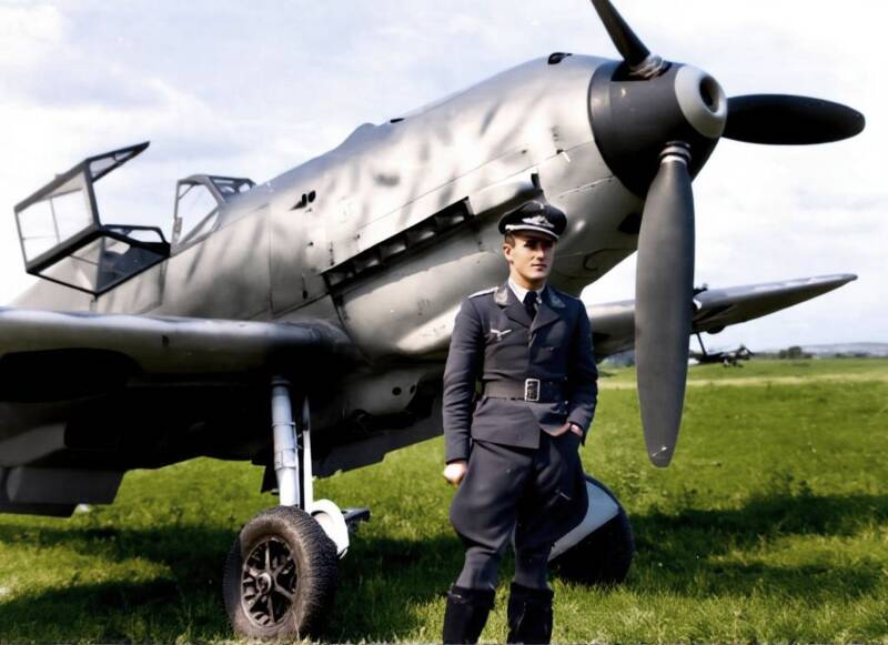 Lt. H Marx in front of his Me109E-4 fighter-bomber, Yellow 3. On the 27th July, Marx shot down a Hurricane fighter being flown by Flight Lieutenant P.A.N Cox. Cox did not survive.