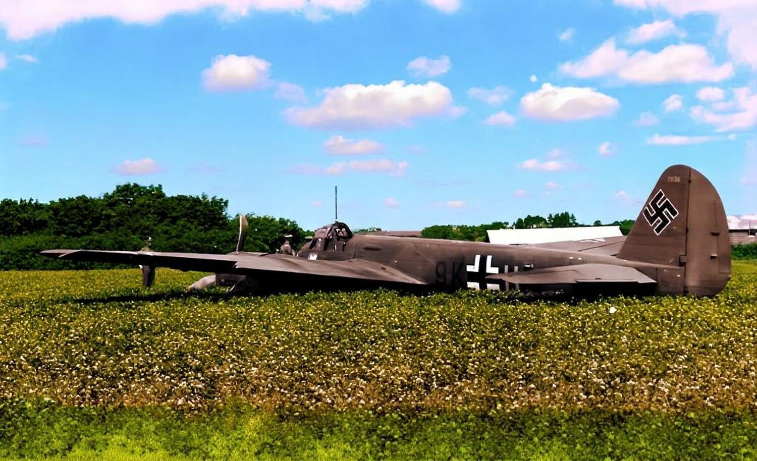 A Junkers Ju 88A-1 bomber 'Edelweiss', code 9K+H, of 3./Kampfgeschwader 51, after crash-landing at Buckholt Farm in Hampshire on the night of 27 July 1940. The crew had been tasked with bombing Crewe but became disorientated and flew over Dublin before realising their mistake. With fuel critically low, the pilot was forced to make an emergency landing, and the four crew members were captured following a brief exchange of fire with British troops.