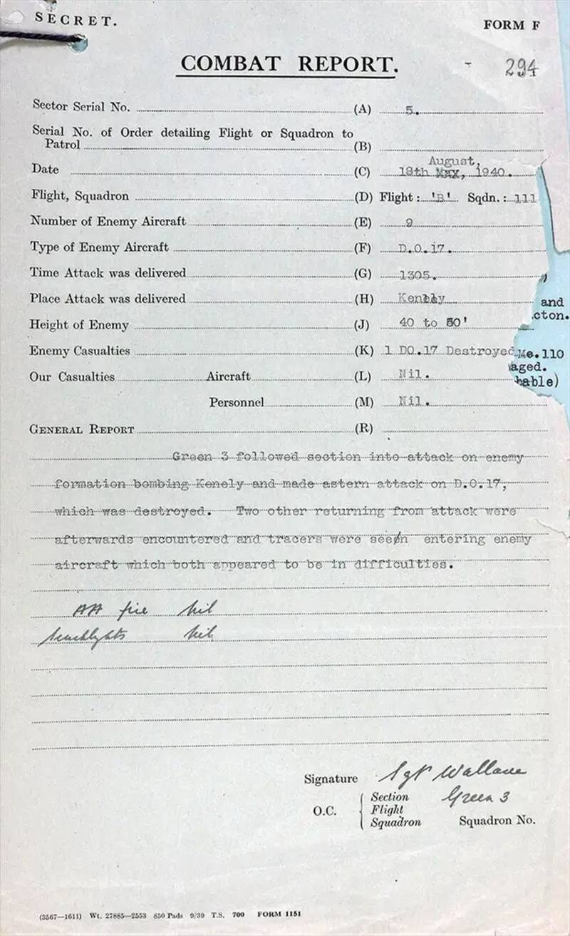 Aircrew including fighter pilots were required to complete a brief combat report after each engagement with enemy aircraft. In this example, Sergeant Wallace of 111 Squadron flew in his Hurricane from the satellite airfield at Croydon and met the low-level bombers near Kenley. He included a short account of the action, identifying the German aircraft type, altitude and time of day.