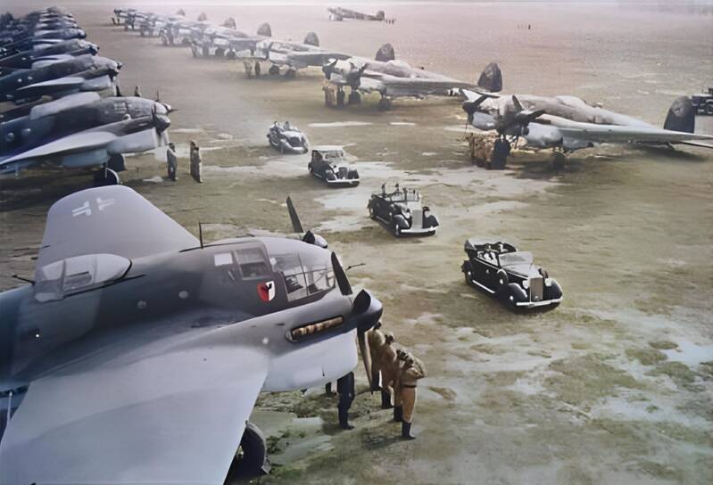 Luftwaffe Heinkel III' bombers lined up during Adlerangriff. Adlerangriff was the German offensive to destroy the RAF and gain air superiority for a planned invasion. Beginning on the 13th August 1940, it targeted airfields, but poor coordination and intelligence led to heavy German losses, failing to achieve its goal.