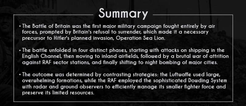 The German strategy was to use large formations of bombers, heavily protected by fighter escorts, to hit key RAF airfields, radar stations, and aircraft factories.