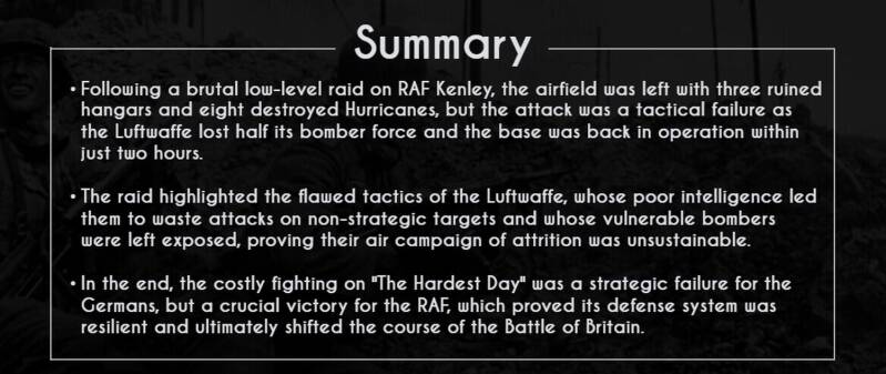 The attack on Kenley, despite its ferocity, ultimately failed to put the airfield out of commission for more than two hours, a testament to the remarkable resilience of the British defense system on "The Hardest Day."