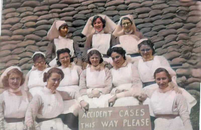 Casualty theatre team after the November 1940 blitz. Photograph courtesty of Margaret Mathews, whose mother, Gladys Chricton, is second from the right.