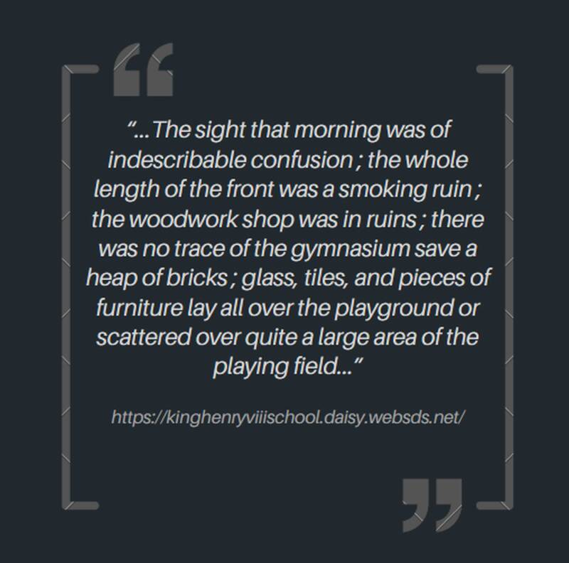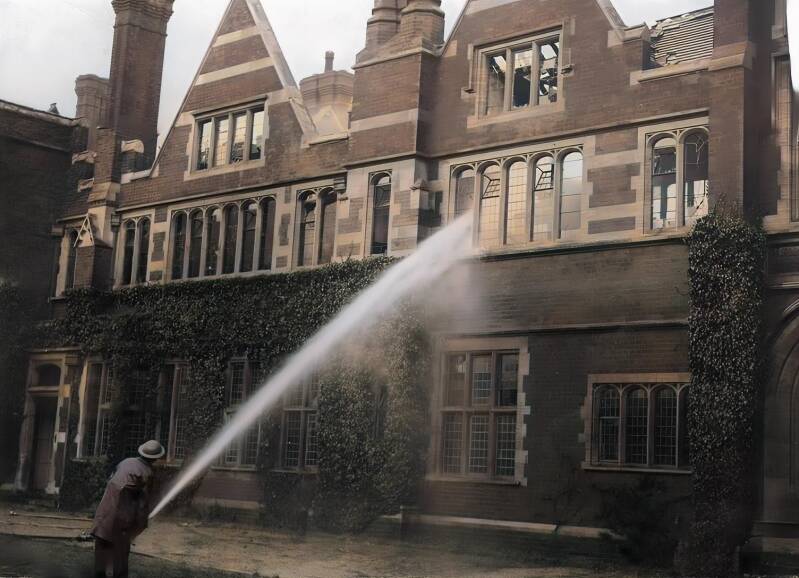 As sirens wailed and bombs rained down, the school's students and staff, led by the courageous efforts of Mr. E. B. Shipley, the senior history master, valiantly endeavoured to protect their beloved school from the encroaching inferno.