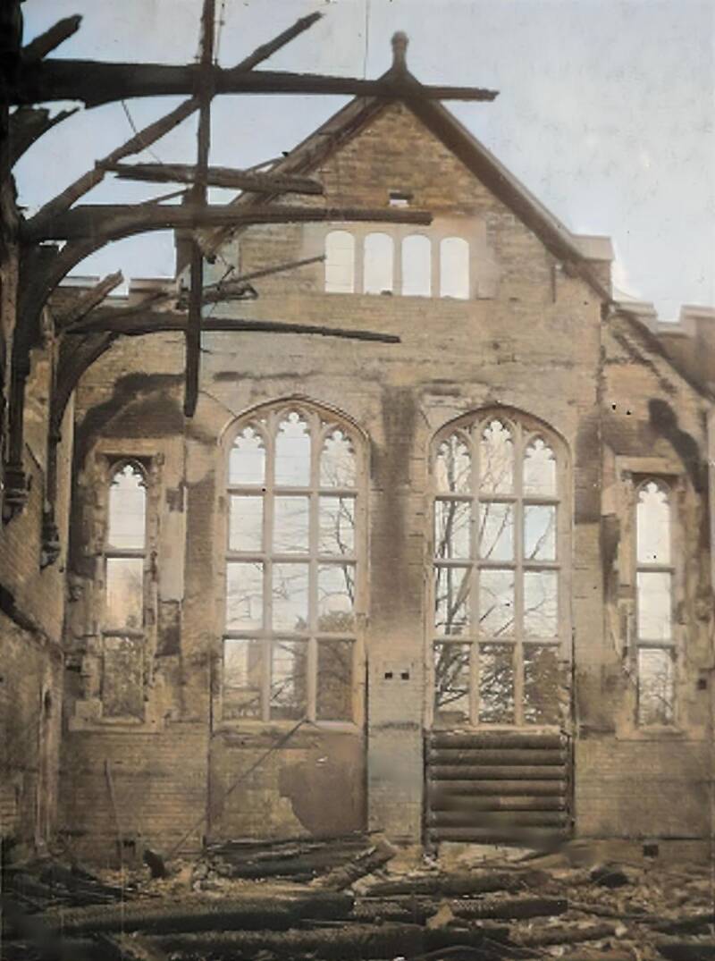 An incendiary bomb had become lodged behind a chimney, igniting a fire that posed a grave threat to the entire school.