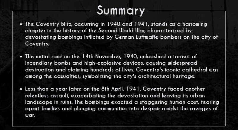 Waves of incendiary bombs and high-explosive devices rained down on Coventry, igniting a fiery inferno that engulfed homes, factories, and landmarks.
