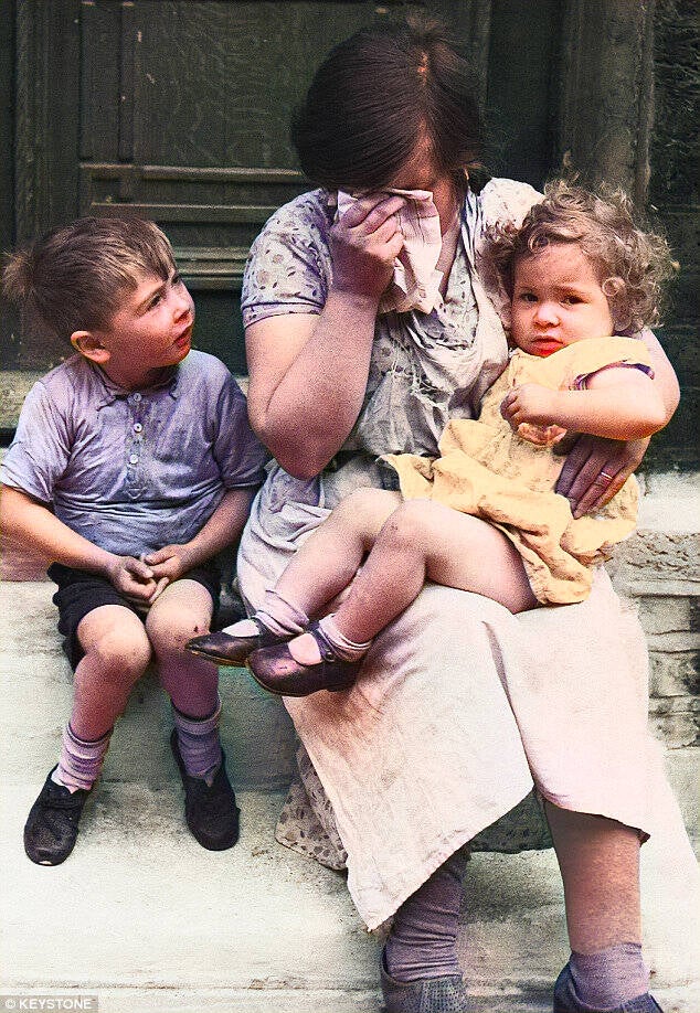 A distressed mother and children after their home had been destroyed during the Blitz.
