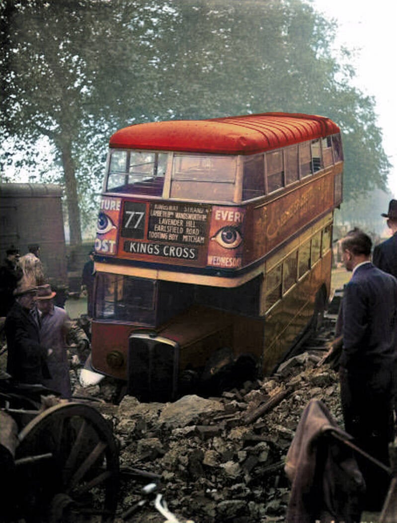 Rescue workers attend to a badly damaged bus in High Holborn, London, amid the damage caused by a Luftwaffe bombing raid during the Blitz.