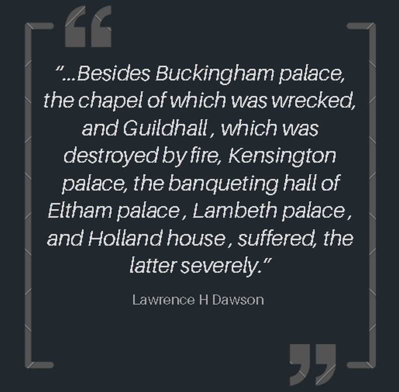 Hospitals, nightclubs, churches, museums, streets with shops and residences, theatres, public places, schools, monuments, newspaper offices, embassies, and the London Zoo were all bombed. The mansions of Mayfair, the opulent apartments of Kensington, and Buckingham Palace itself—which was attacked four times—fared little better than some of the poorer and more congested outlying regions, which were also severely damaged.