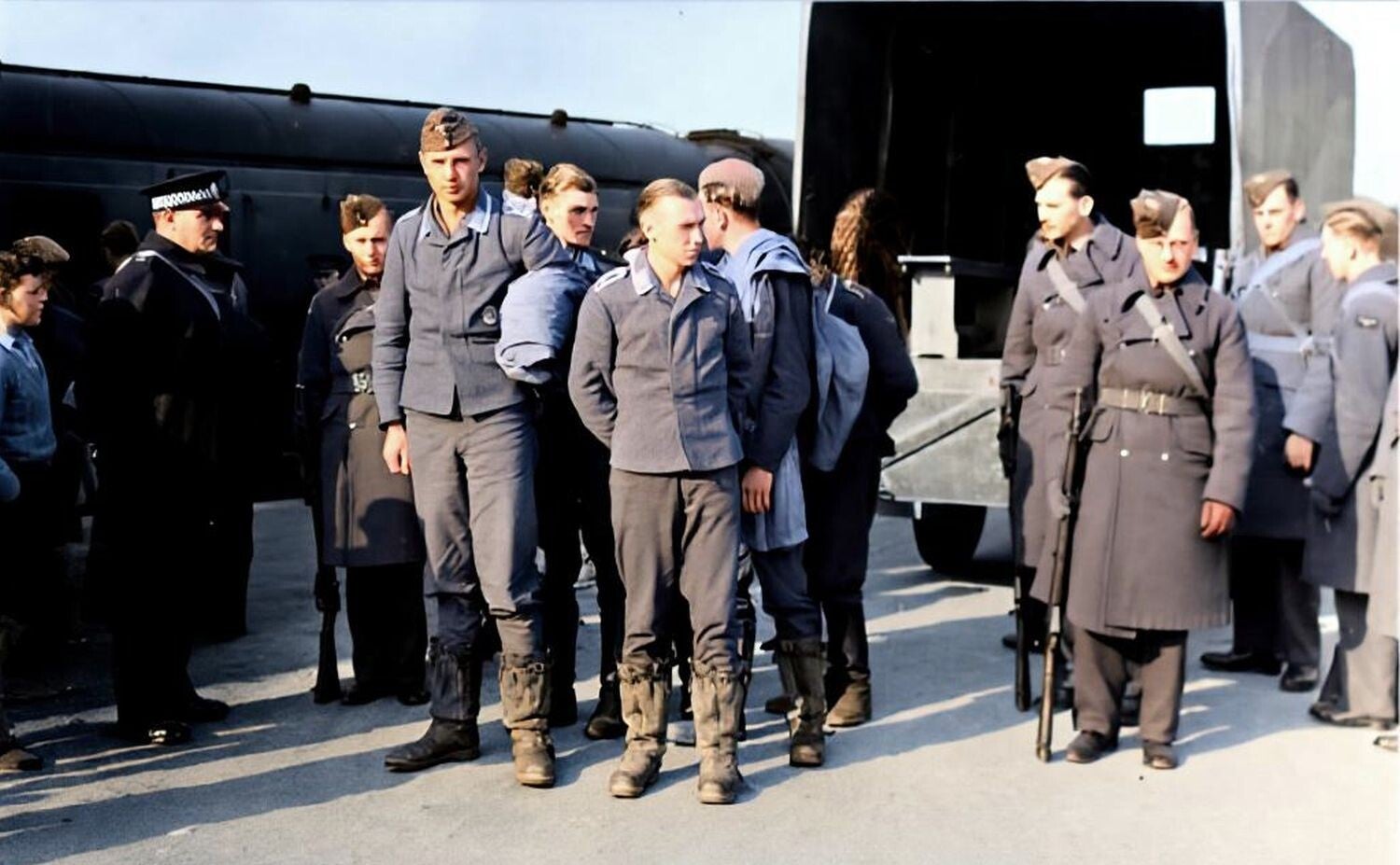 Captured German aircrew being transported under RAF guard, c. April 1940.
