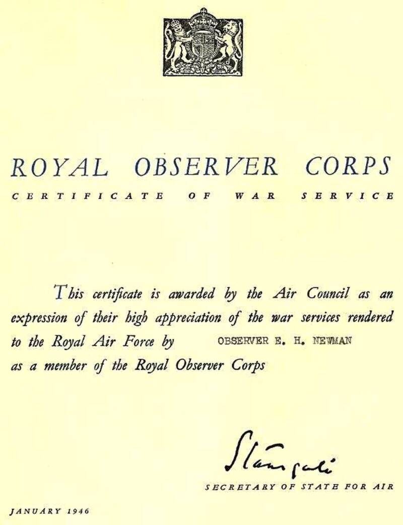 A Royal Observer Corps Certificate of War Service issued in 1946.