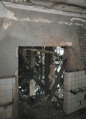 Air-raid damage to the interior of 55 Broadway. Here, a narrow, vertical crater has formed in an interior wall, allowing a staircase to be glimpsed beyond. There has also been some damage to the floor and ceiling, and a pane of glass had been smashed (extreme right).