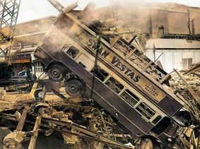 People are still moving along the footway beneath as the double decker bus is removed from the bomb crater.